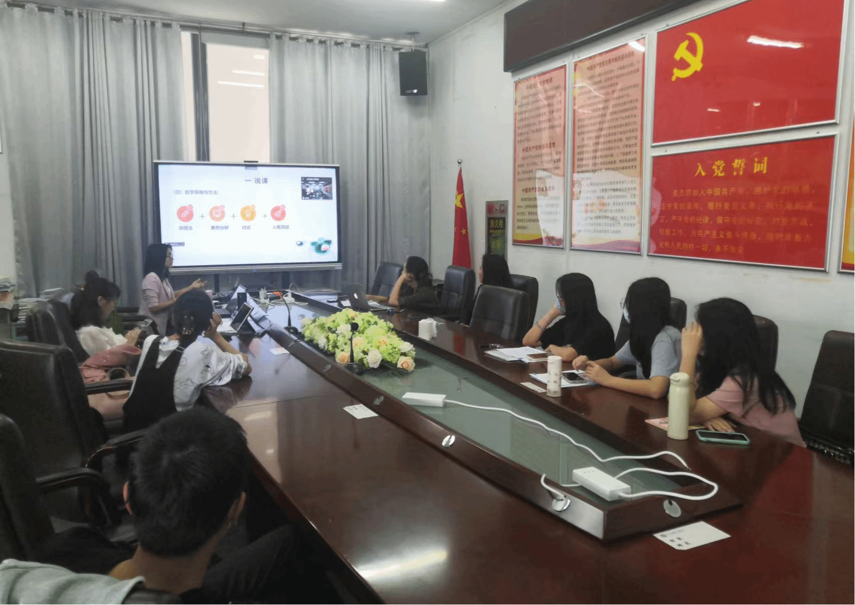 学习结束后,教师第一党支部结合学习党的二十大精神,开展了“课程思政课堂教学设计初赛”主题党日活动。况小雪、侯晓俣、张锐、李卉四名教师党员参加了比赛。