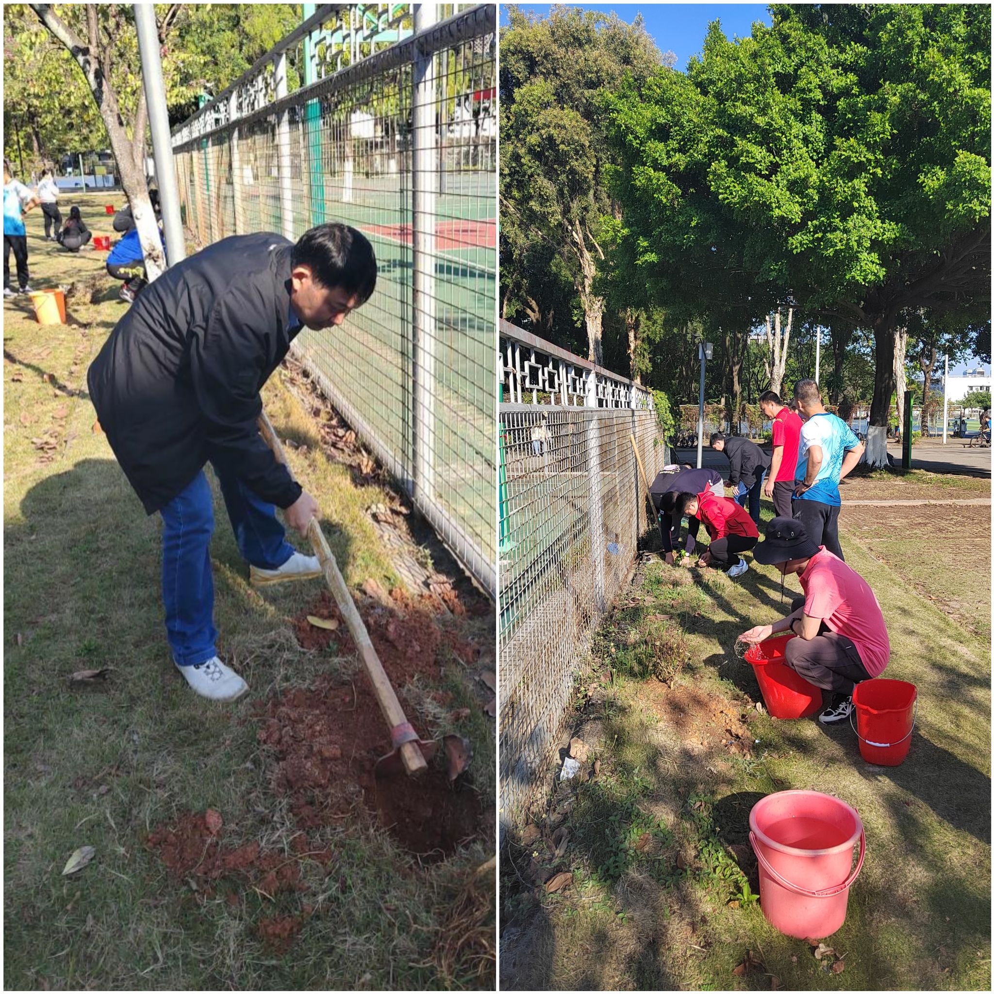 教师第二党支部开展了“爱绿 植绿 护绿”活动。3月12日下午,公司党委书记张伟林以普通党员的身份,与支部党员一起参加了植树活动。为校园绿化带开展除草、施肥、修枝,并在篮球场围栏边种了30棵金银花和10棵百香果爬藤植物,为美化校园增添了一份新绿。