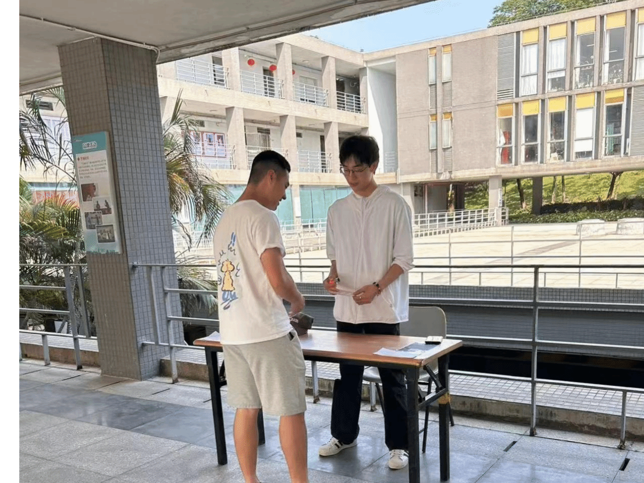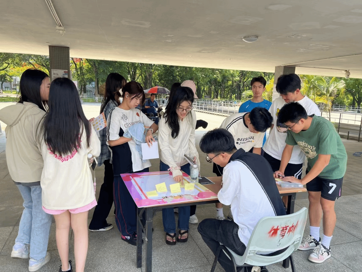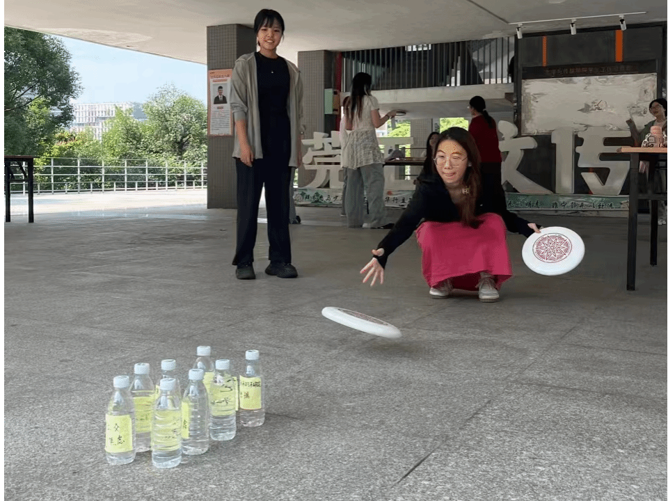 在“打倒烦恼”打卡点中,同学们将贴有心理烦恼的水瓶用飞盘击倒。此游戏帮助同学们有效释放自己的心理压力。