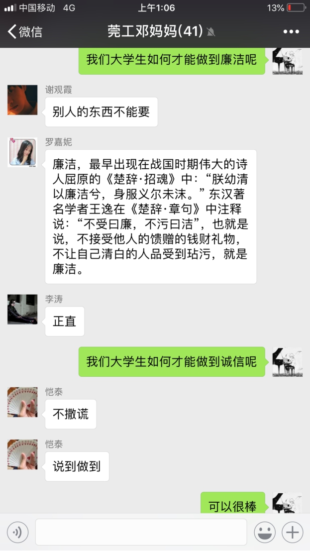 通过开展“老员工廉洁诚信教育”活动,同学们的反响十分主动积极,认为这个廉洁宣传非常有必要,希望学校能多开展廉洁教育演讲等相关活动,倡导在大学校园弘扬“敬廉崇洁,人人知诚信,人人讲诚信”的精神。