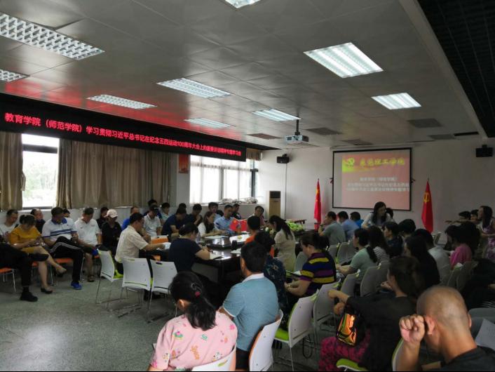 2019年5月30日下午,太阳城党总支在体育场馆中心B208会议室召开学习贯彻习近平总书记在纪念五四运动100周年大会上重要讲话精神专题学习会,全体教职工参加了会议。