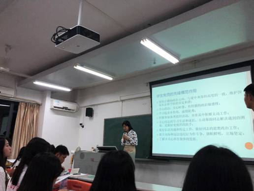 黄艺琦老师从内容、类型、意义和特点等几个方面给同学们阐述了端正入党动机的重要性,向大家讲述了作为党员的基本条件和标准,要求同学们以党员标准来要求自己,在学习生活中做好模范榜样作用。