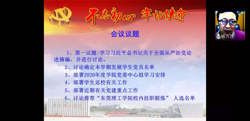 会议进行第一议题,杨万江书记分别从全面从严治党,确保党始终成为中国特色社会主义事业的坚强领导核心;党要管党首先要从党内政治生活管起,从严治党首先要从党内政治生活严起;坚定理想信念,补足精神之钙;牢固树立“四个意识”,坚决维护党中央权威;坚持把纪律挺在前面,严明政治纪律和政治规矩;从严治吏,培养选拔党和人民需要的好干部;作风建设永远在路上;以零容忍态度惩治腐败反对腐败;加强党内监督,发挥巡视利剑作用;落实全面从严治党主体责任十个方面和全体参会人员一起学习了习近平总书记关于从严治党的重要论述,大家积极地发表了学习心得。