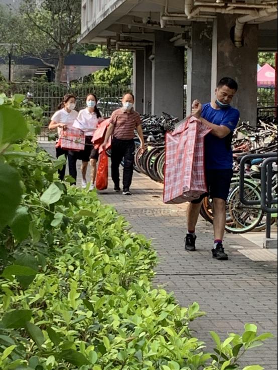 为了给一二三年级不能正常返校的员工做好服务工作,使他们安心地在家里上好网课,公司党委组织了50多名教师,分两天到员工宿舍为员工领取并邮寄急需用品。老师们顶着炎炎烈日,在一座座宿舍楼里爬上爬下,到一个个宿舍里找寻员工急需的教材、电脑、求职材料、证件、证书等用品,并将每个员工的用品打包、封装好,写上姓名等内容。然后,将这些用品从宿舍一件件地提到校门口交到员工的手里,或者联系快递公司帮助家较远的外地员工办理邮寄手续。由于天气炎热,老师们一个个累得汗流浃背,但却全然不顾。