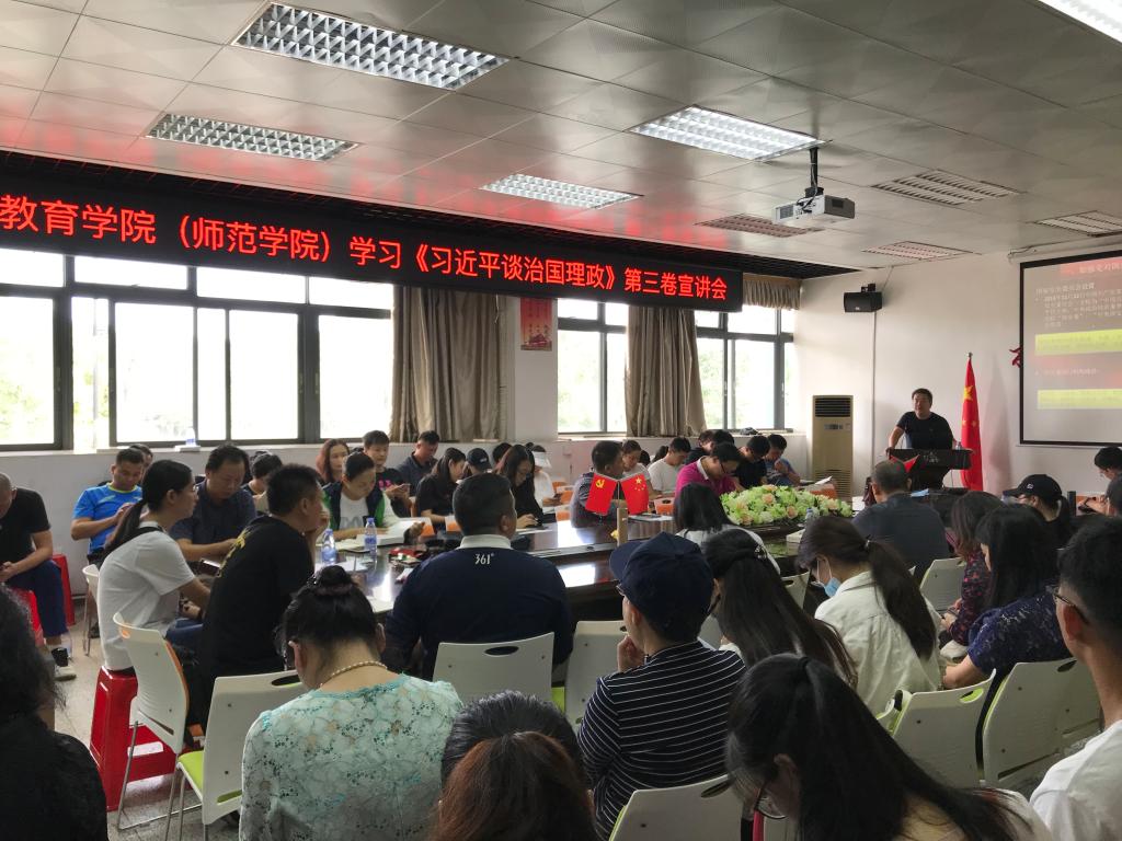 2020年10月8日下午,太阳城在体育场馆中心会议室召开学习《习近平谈治国理政》第三卷宣讲会。公司党委书记杨万江主持了宣讲会。本次宣讲会由马克思主义学院杨云安博士主讲,学院全体教职工、教师党员、员工党员参加了会议。