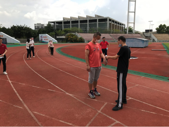 演练人员抵达真草田径场北门后,工作人员对员工进行体温测量、体温无异常后出示校园码或莞工支付码核查身份,核对员工证和身份证无误后。在员工排队等候考试时,每个人之间保持间隔1.5米。