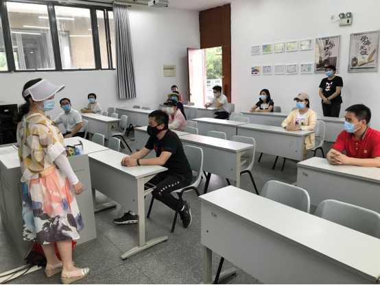 员工考试时,监考老师提醒员工取下口罩,简要说明考试规则,进行考试,监考老师记录考试成绩,员工完成考试,从真草田径场南门有序离开。