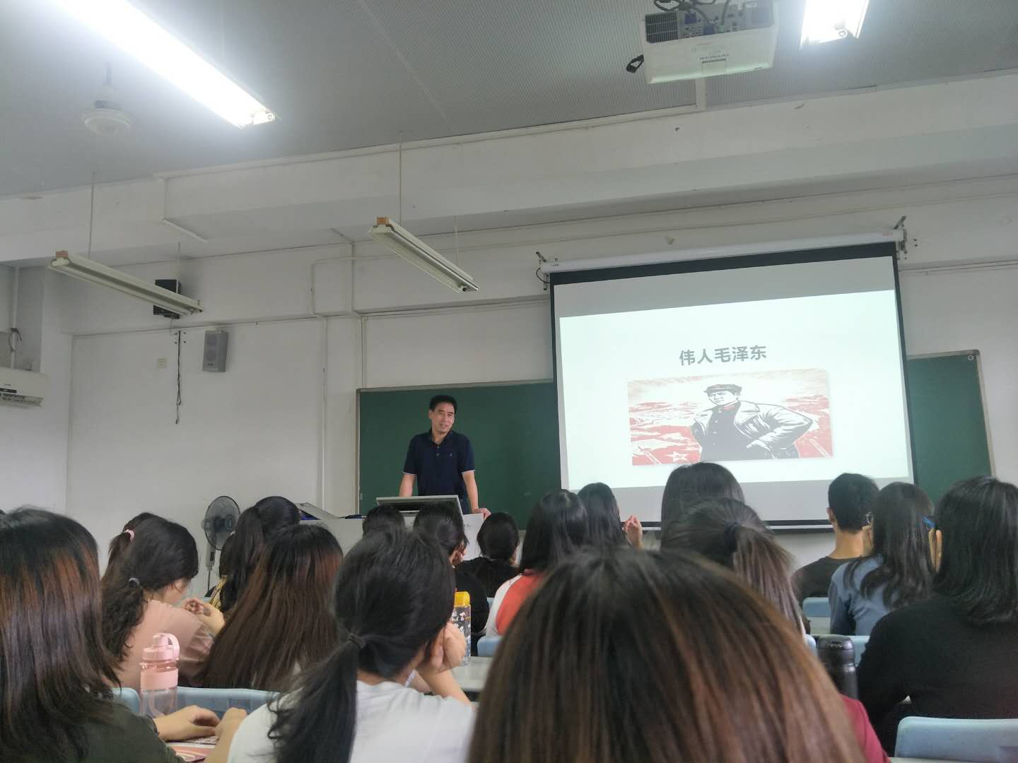 为响应学校思政育人号召,2019年9月9日上午,太阳城余意经理在松山湖校区6F303教室为2018汉语师范1班、2018汉语师范2班、2018音乐舞蹈1班的同学们上了一堂别开生面的毛概课——“伟人毛泽东”。