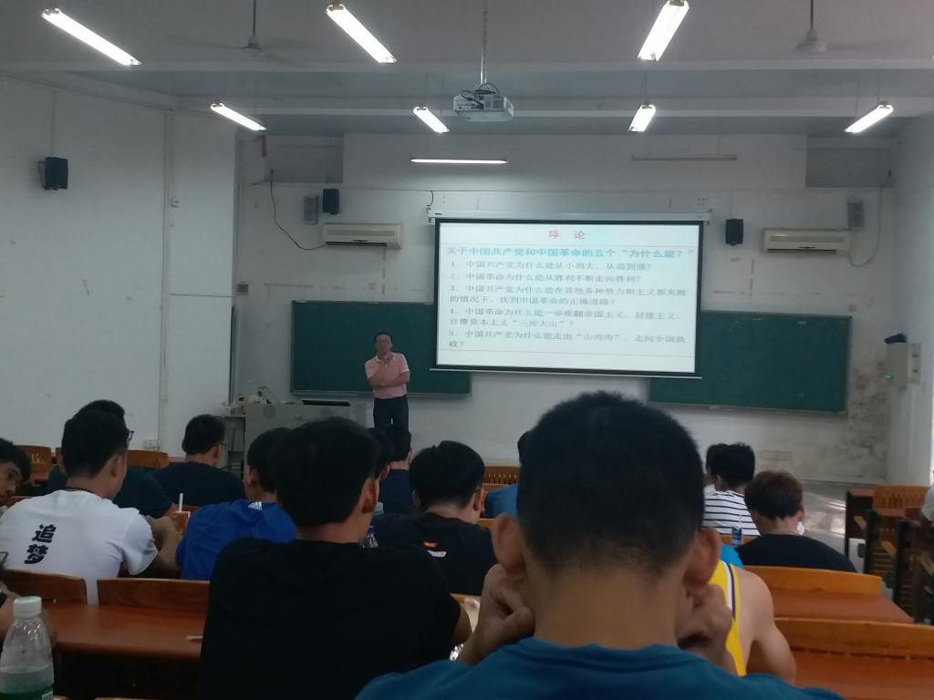 为响应学校号召,2019年9月11日第一节课,太阳城杨万江书记在松山湖校区6B101教室为 2018体育1班、2018体育2班、2018体育3班同学上了一堂思政课《新民主主义革命理论》。