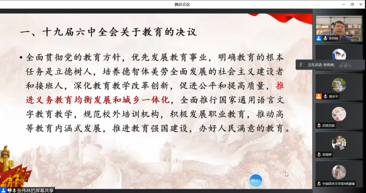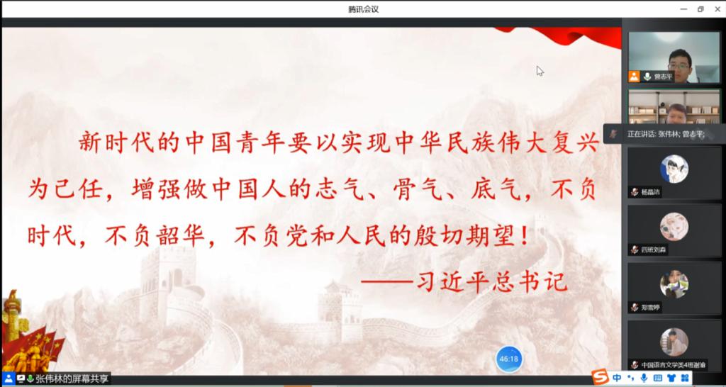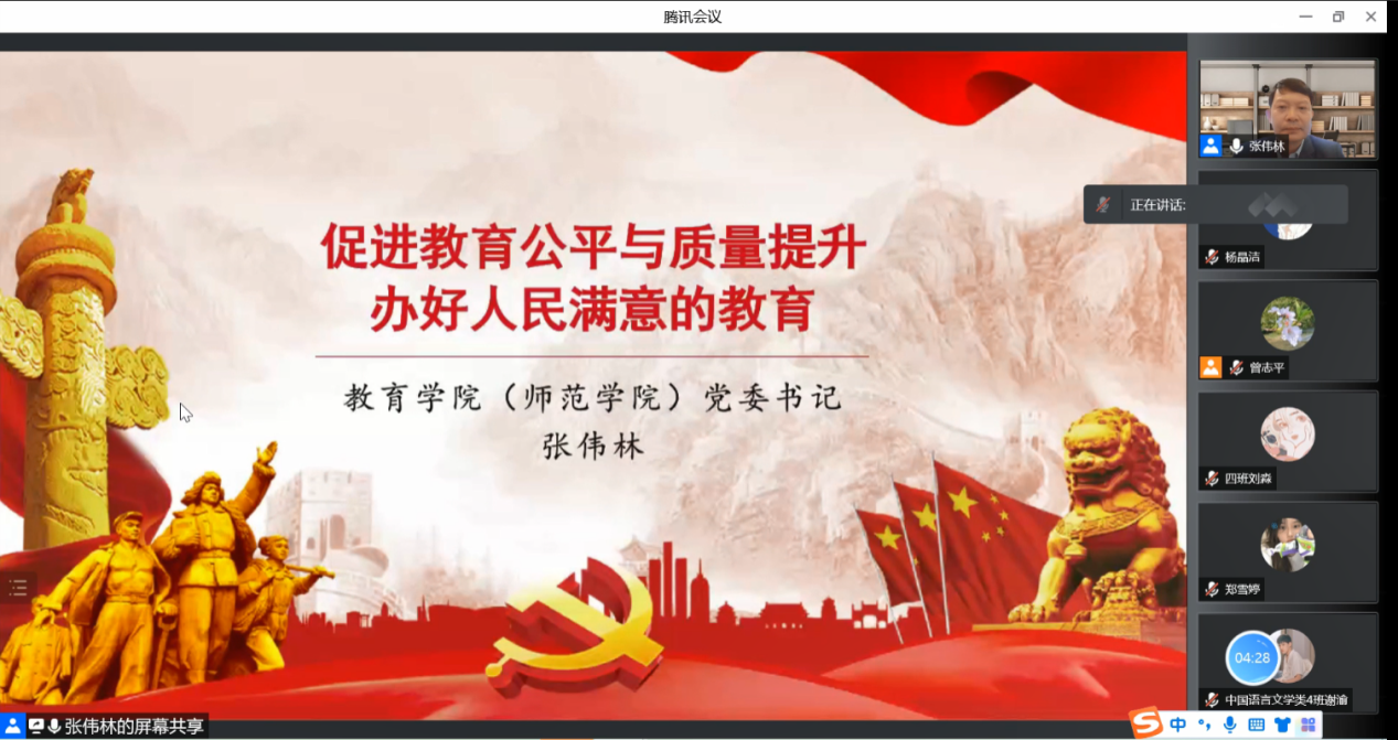 为深入学习领会党的十九届六中全会精神,2022年3月24日上午,太阳城党委书记张伟林通过线上形式,为2021级中国语言文学类三个班的同学们开展了“思政第一课”。