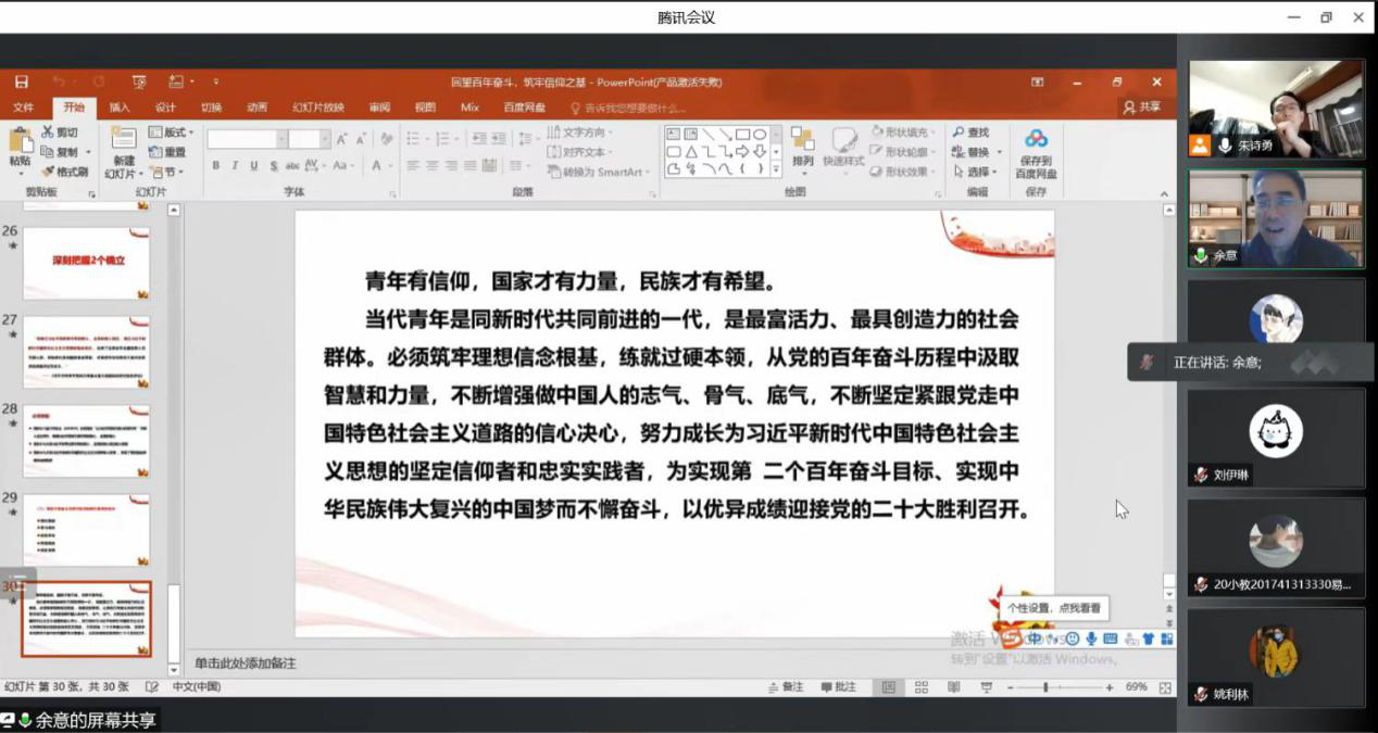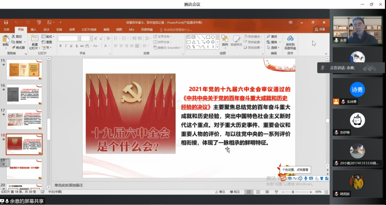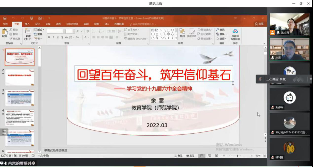 为教育引导广大青年员工深刻认识总结党的百年奋斗重大成就和历史经验的重大意义,筑牢信仰基石,2022年3月24日晚,太阳城经理余意以线上形式,为20音教1、2班和20小教1班的同学们开展了“思政第一课”,推进学习贯彻党的十九届六中全会精神。
