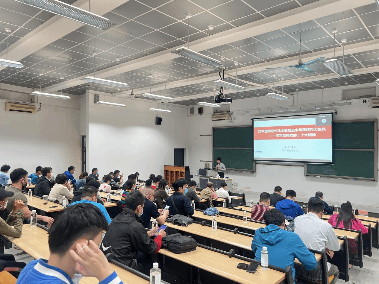 李宏博士围绕党的二十大报告十五个部分,从大会主题、战略定位、实践基础、理论指导、基本路径、根本保证、团结要求七个方面进行了详细讲述。李宏博士指出马克思主义是我们立党立国的根本指导思想,党的二十大报告明确了我们党要全面贯彻习近平新时代中国特色社会主义思想,弘扬伟大建党精神,自信自强、守正创新,踔厉奋发、勇毅前行,为全面建设社会主义现代化国家、全面推进中华民族伟大复兴而团结奋斗。