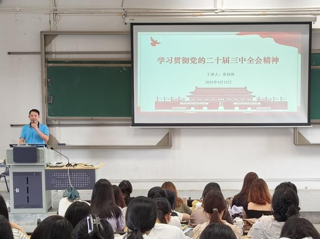2024年9月13日,公司党委书记张伟林在6E308为2023级汉语言文学(师范)1、2班和2023级音乐学(师范)1、2班同学讲授主题为“学习贯彻党的二十届三中全会精神”思政第一课。