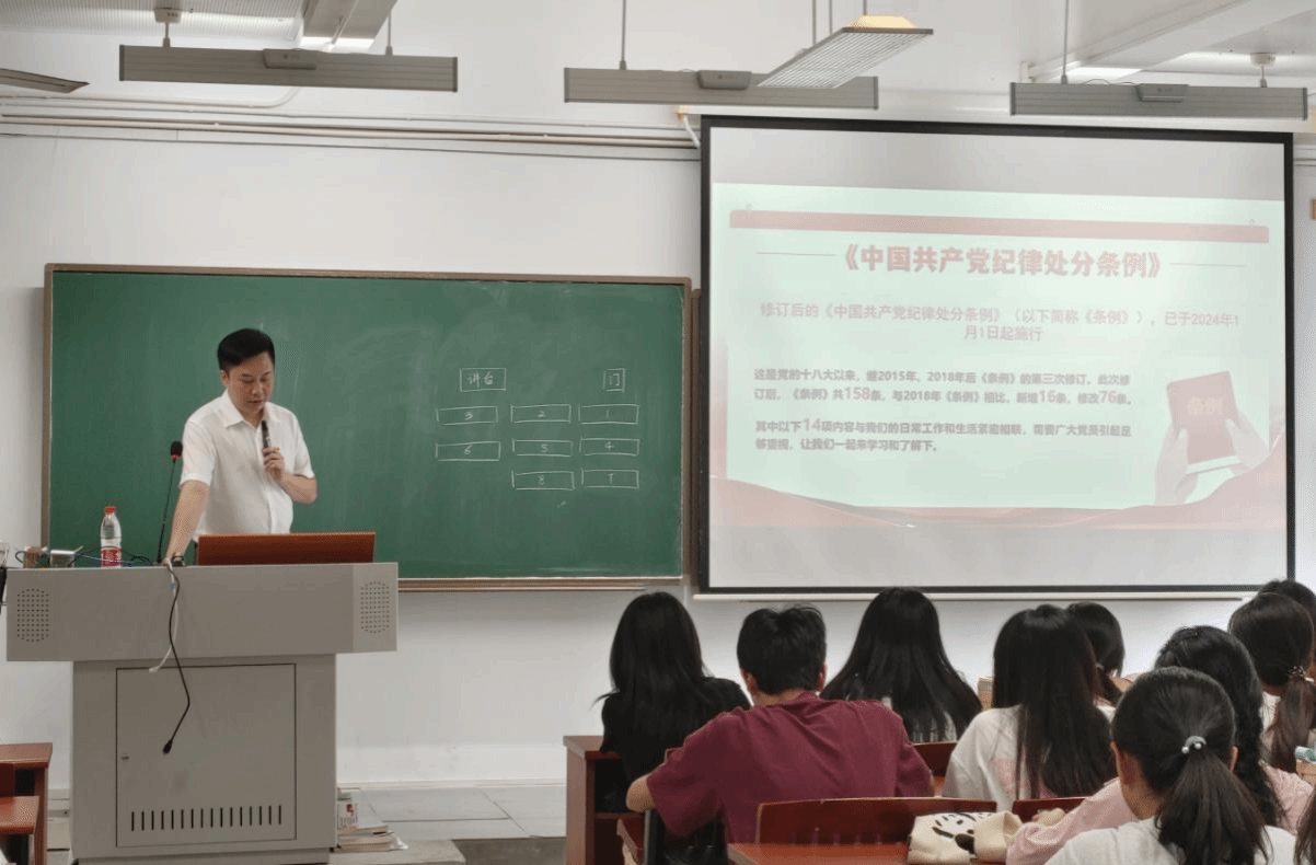杨帆副书记首先向入党积极分子介绍了《中国共产党纪律处分条例》的新修订内容,紧接着通过一张张幻灯片,带着入党积极分子学习新修订条例的具体内容。