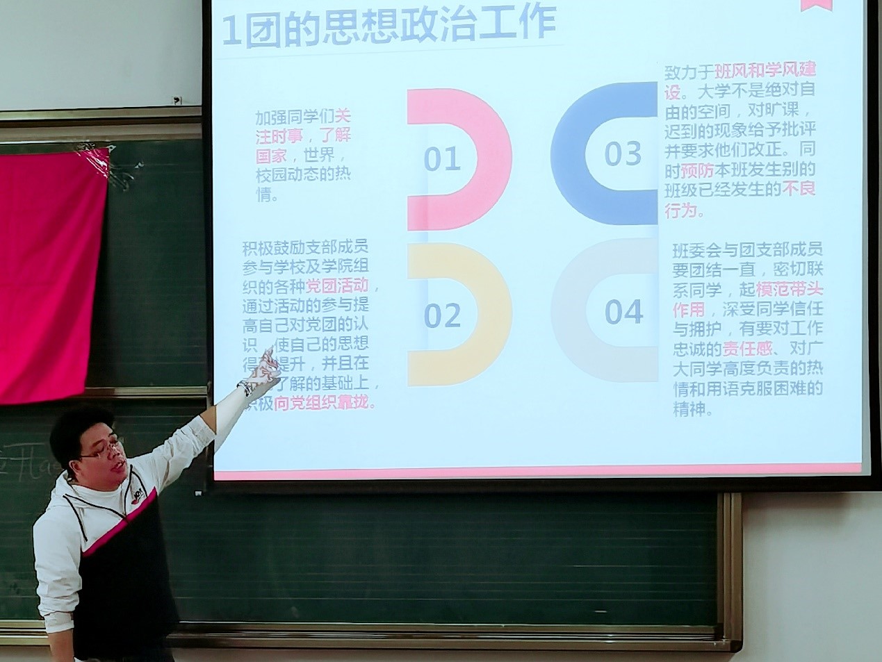 然后,袁老师讲到团干部的具体工作,提出团干部要明确党的政治思想工作,需要以身作则,发挥思想引领的作用。袁老师建议同学们关注时事,了解国家,世界,校园动态的热情。袁老师就团的宣传工作也作了四点要求,即做到针对性、吸引力、预见性和鼓动性。袁老师希望同学们在团的文体工作中提高青年的思想觉悟。