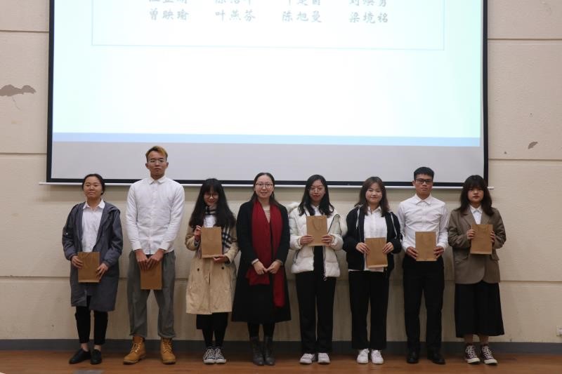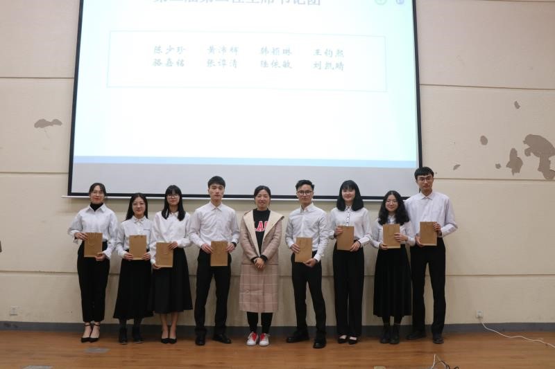 随后,黄佳雷老师上台讲话。在候选人演讲完毕后,黄艺琦、王凌卿、袁志军、黄佳雷老师给上届干部颁发精美礼品并合照留念。