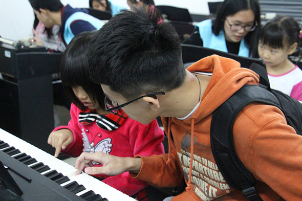 本次活动的主题是对公司后勤员工的小孩进行音乐素质培训,教小朋友们弹奏钢琴曲《小星星》,由师范学院志愿服务站的莫晃杰同学担任本次活动的主讲“老师”。