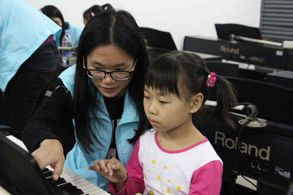 在活动过程中,师范学院的老员工“小老师”们耐心地教小朋友们弹奏。简单的教学、练习过后,小朋友们进入了弹奏比拼环节,现学现弹对于这些年龄不到10岁的小朋友们来说,虽然很难,但他们都能努力地去完成。看到小朋友们拿到奖品后脸上露出花一般的笑容,“小老师”也真切地体会到了本次活动的真正意义。