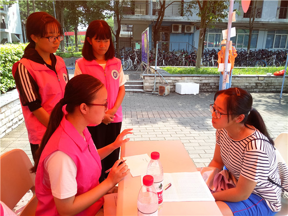 志愿服务站中午十二点开始布置场地,写宣传纸,分咨询处和面试处,小干事们都很积极,五点多收摊,招新结束。