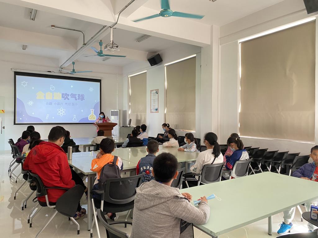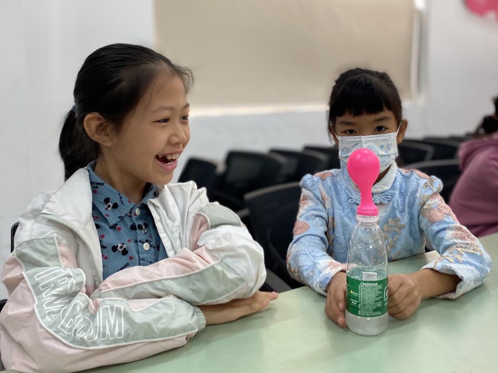 本次活动共分为化学实验课和街舞教学课两部分。教员宋莹莹首先向小朋友们讲解了“全自动吹气球”、“喷泉实验”、“分子快跑”三个化学小实验的原理,随后教员们共同带领小朋友们完成实验,让他们在动手实践中感受到了化学的神奇与魅力。其后,教员李咏心和曾伊琪带领小朋友们进行热身运动,进行简单街舞动作教学,让小朋友们充分体会到了街舞的乐趣。