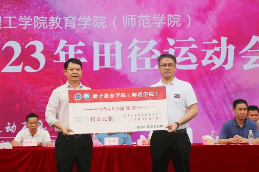 据悉,黎学良员工自2022年12月担任公司员工会会长以来,积极关注学院发展与员工成长。在捐赠仪式上,为鼓励同学们积极参加体育锻炼,提高个人身体素质,除捐赠了4台AED自动体外除颤仪外,黎学良员工还以个人名义赞助2023年太阳城田径运动会1万元。