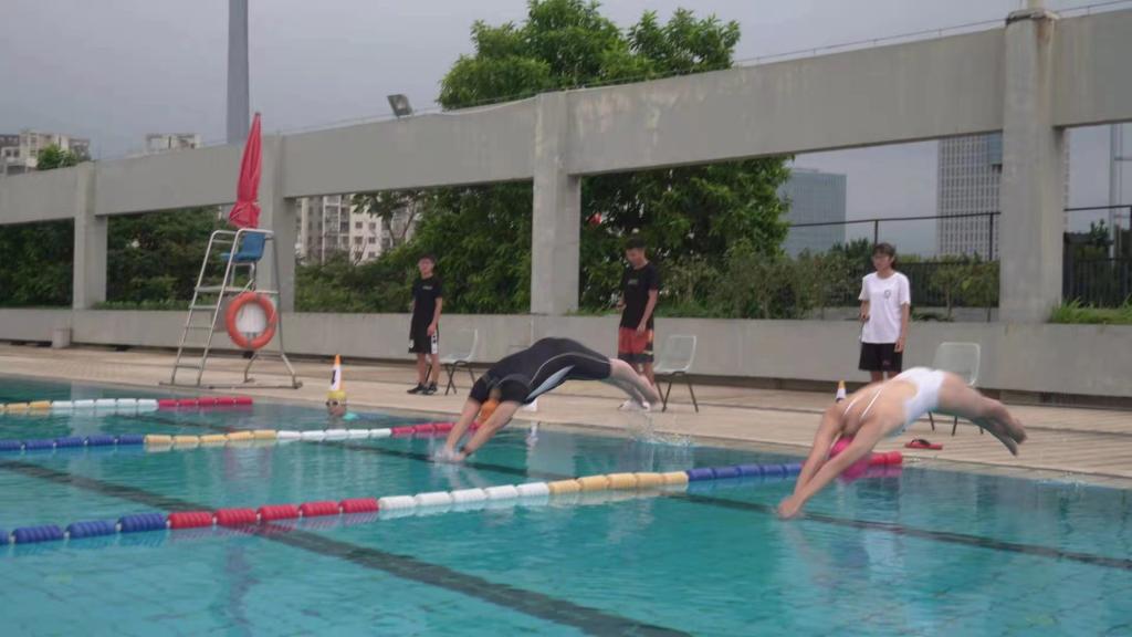 运动会分为个人项目和趣味团体游戏。首先进行的是个人项目的水上大比拼。个人项目分有50米蛙泳、100米蛙泳、50米自由泳、100米自由泳和50米仰泳。学院13位老师参与了个人单项游泳比赛,“泳”出了各自的风采。个人项目比赛结束后,游泳专业刘兰老师应各专业老师强烈要求,为老师们表演了精彩的50米蝶泳项目,获得热烈掌声与喝彩。而后进行趣味团体游戏环节,该环节共分为四个小组,进行“游泳圈接力游戏”和“持球速走”比赛。学院全体教职员工本着友谊第一,比赛第二的精神积极参与此次水上运动会,现场气氛热烈。