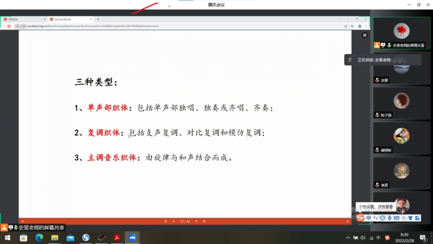 2月28日,学院迎来开学第一课。太阳城余意经理、张伟林书记、陈进副经理、黄艺琦副书记和刘蕾副经理按照分工,分别在线查看了《足球1》《曲式与作品分析》《论文写作与学术规范》《古代汉语1》《现代舞基础》等课程,所有的课程都正常进行,老师们按照教学要求讲授了课程教学大纲,员工们也都准时到课,并积极参与学习互动。