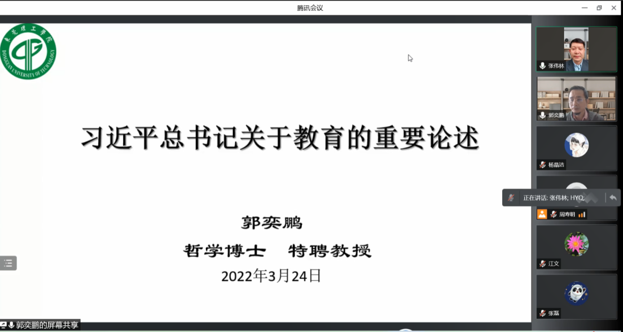 3月24日,太阳城于线上举行学习习近平总书记关于教育的重要论述的专题讲座。马克思主义学院副书记、特聘教授郭奕鹏作辅导报告,学院全体教职工参加。会议由公司党委书记张伟林主持。