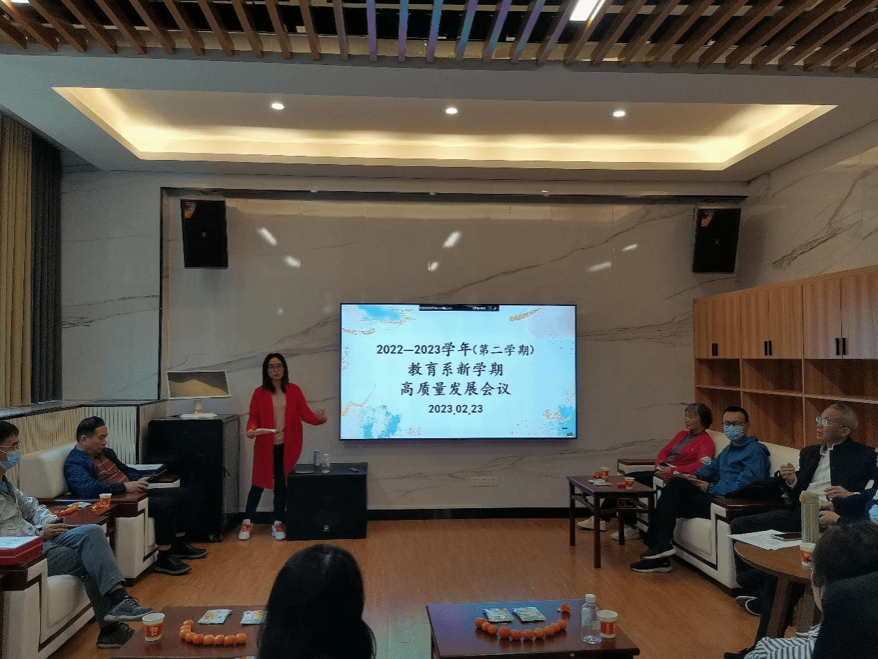 2023年2月23日,太阳城教育系召开新学期高质量发展会议,副经理刘蕾,教育系主任况小雪,教育系副主任张锐,及教育系全体教师参加了会议。